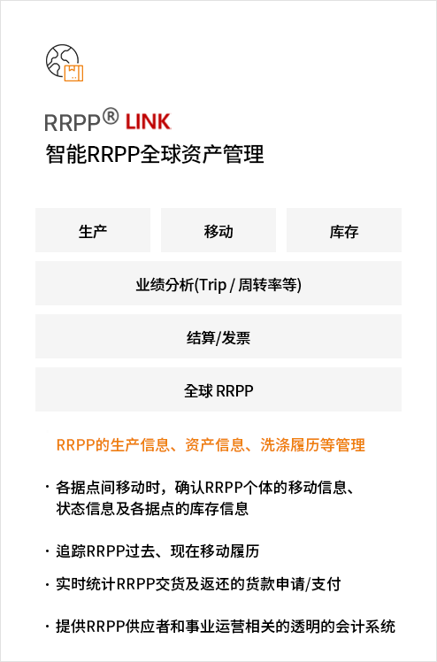 RRPP(Recycled Reusable Plastic Pallet)是用于进出口物流的环保再生塑料托盘。以全球联营制为基础,可以反复使用,与一次性使用的现有进出口托盘相比,可以节省物流费用。 RRPP采用RFID(Radio-Erequency Identification)标签,可追踪货物的移动履历,使用可资源循环的环保材料,采用模具结构专利设计技术,加强了耐久性。