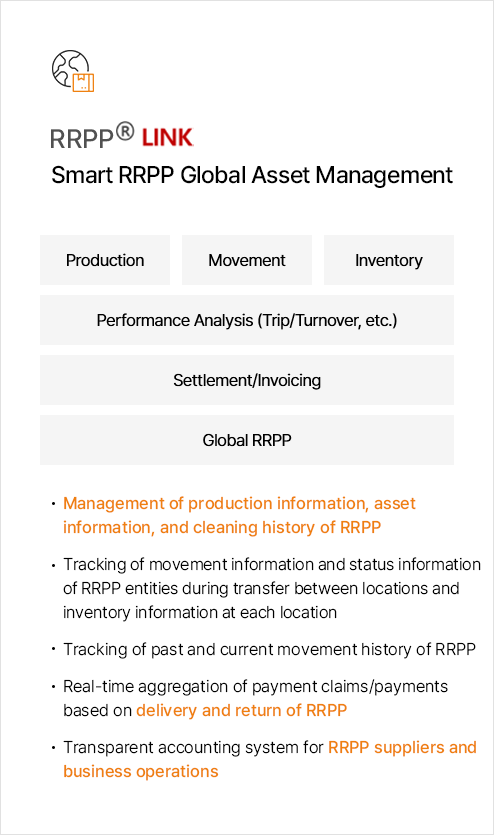 RRPP (Recycled Reusable Plastic Pallet) is an eco-friendly recycled plastic pallet used in import and export logistics. Based on a global pool system, it can be used multiple times, resulting in cost savings compared to single-use pallets traditionally used in import and export. RRPP is equipped with Radio-Frequency Identification (RFID) tags for tracking the movement history of freight. It is made from environmentally friendly materials that can be recycled, and its durability is enhanced through patented mold structure design technology.