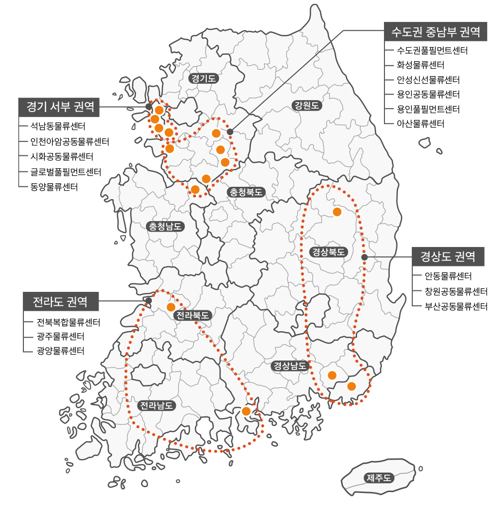 전국 17개 물류거점 및 수배송망을 구축해 FMCG, 전기전자, 자동차, 유통 등 다양한 산업군 고객사에게 공동물류 서비스를 제공합니다